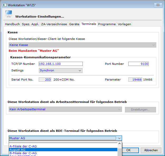 Ist die BDE (Betriebsdatenerfassung) lizenziert, so kann in den Systemeinstellungen Workstation im Register Terminals festgelegt werden, dass die aktuelle Maschine (der aktuelle Client) das BDE-Terminal ist - d.h. dass dieser Client als BDE-Gerät arbeitet. In diesem Fall läuft bossERP beim nächsten Start als BDE-Gerät für die Rückmeldung des Ressourcenverbrauchs (Produktion) und nicht mehr in der gewohnten bossERP -Umgebung.