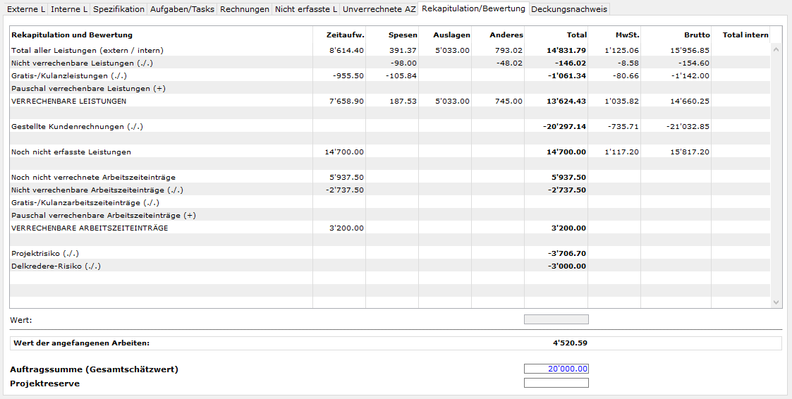 dargestellt und in eine Rekapitulation und Bewertung übernommen, indem die Risiko-Einträge aus dem Auftragsdossier, die hier noch korrigiert werden können, übernommen: