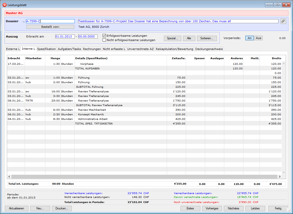 Tätigkeit oder Aufgabe (gemäss Dossier), sortiert mit Zwischensummen |