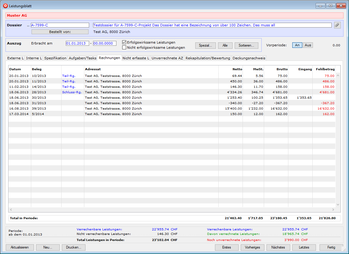 | Wichtiger Hinweis | Es werden auf dem Leistungsblatt alle Rechnungen des Dossiers gezeigt, ob sie Leistungen im Register 1 enthalten oder nicht. Wenn ein datumsmässig eingeschränkter Auszug "Erbracht am" erfolgt, so dass nur noch wenige oder gar keine Leistungen gefunden und angezeigt werden, können auch keine Rechnungen aufgelistet werden. |