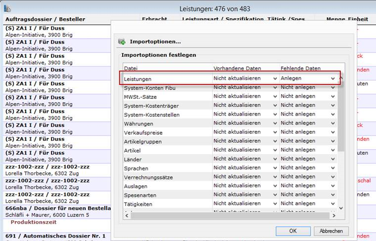 Falls noch keine Import- bzw. Abgleichdefinitionen existieren, müssen sie manuell festgelegt werden. Hier das Beispiel, dass nur die Datei "Leistungen" definiert wird. Alle andern werden weder aktualisiert noch angelegt. Das heisst: es wird davon ausgegangen, dass insbesondere die Auftragsdossiers mit den übergebenen Fremd-IDs existieren. Ebenso darf es nur genau einen Artikel mit dem übergebenen Artikelkürzel geben.
