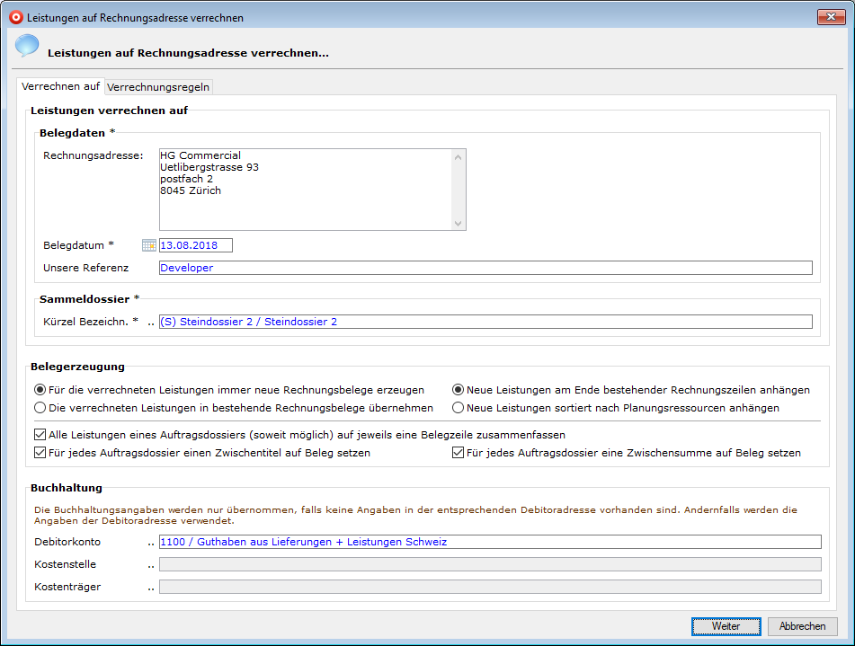 In diesem Verrechnungsprozess geht es darum, Leistungen unterschiedlicher Dossiers mit gleicher Rechnungsadresse zu verrechnen: