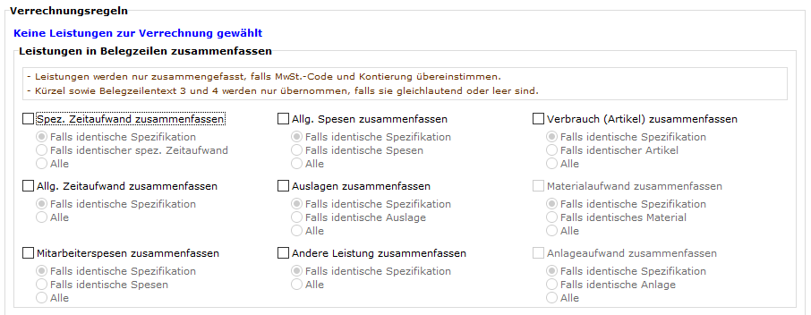 Verrechnungsregeln und Optionen für das Zusammenfassen von Leistungen