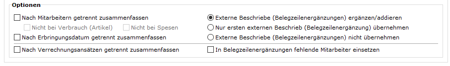 - Die Checkbox "In Belegzeilenergänzungen fehlende Mitarbeiter einsetzen" bedeutet, dass - wo sie fehlen - anhand der Arbeitszeiteinträge - der Name und Vorname des Mitarbeiters, auch wenn sie nicht getrennt zusammengefasst werden, eingesetzt wird. Zusammengefasste Leistungen gehören alle zum selben Mitarbeiter.