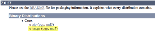 Download a binary distribution of the core module: apache-tomcat-7.0.26.tar.gz from here. I picked the tar.gz in Binary Distributions / Core section. Folgende URL ist unter “here” zu finden: http://tomcat.apache.org/download-70.cgi. Downloaden Sie gegebnenefalls die tar.gz.