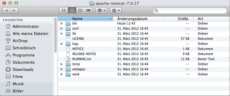 - Es wird ein Ordner „apache-tomcat-7.0.27“ mit folgendem Inhalt angelegt: