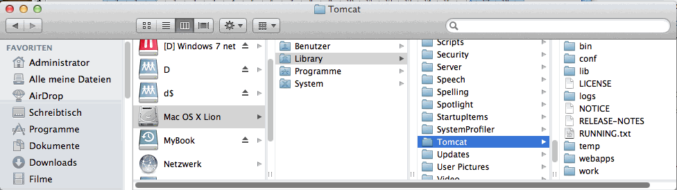 - und legen Sie den entzippten Ordner „Tomcat“ ins Verzeichnis Library des HDD (z.B. Mac OS X Lion), nicht ins Verzeichnis Library des Users.