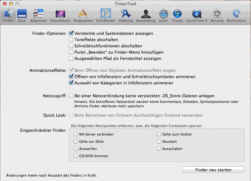 Hinweis: um versteckte Dateien unter Mac anzeigen zu können, gibt es die kostenlose Software Tinker Tools. Im Register „Finder“ kann man die entsprechenden Einstellungen vornehmen. Um damit richtig arbeiten zu können, müssen Sie den Mac neu booten.