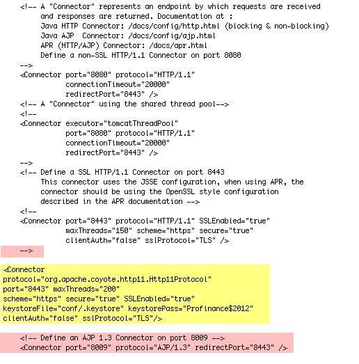 <Connector protocol="org.apache.coyote.http11.Http11Protocol" port="8443" maxThreads="200" scheme="https" secure="true" SSLEnabled="true" keystoreFile="conf/.keystore" keystorePass="bossERP$2012" clientAuth="false" sslProtocol="TLS"/>