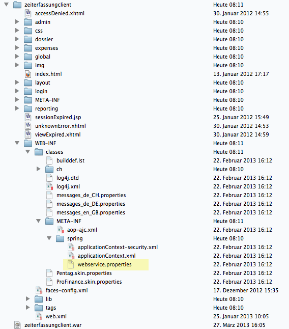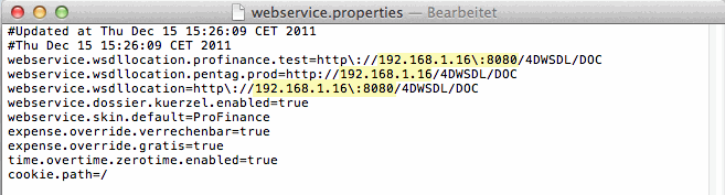 Um die Zuweisung der IP-Adresse und des Ports vorzunehmen, muss die Datei „webservice.properties“ mit TextEdit geöffnet werden, welche sich im Ordner "zeiterfassungclient\WEB-INF\classes\META-INF\spring“ befindet: