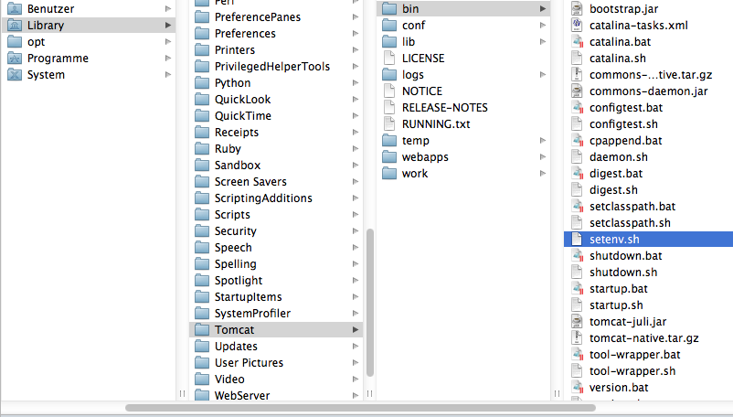 Zu Abschliessen der Installation von Apache Tomcat kopieren Sie bitte die mitgelieferte Datei setenv.sh in das "bin" Verzeichnis der Tomcat Installation, welches sich im Library-Ordner befindet: