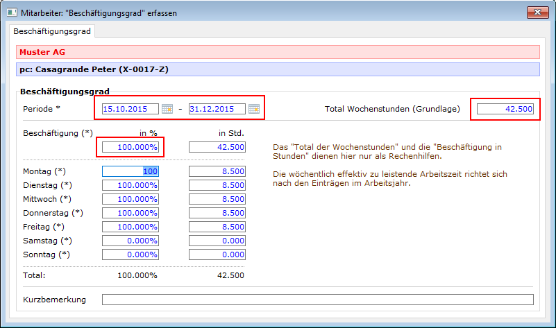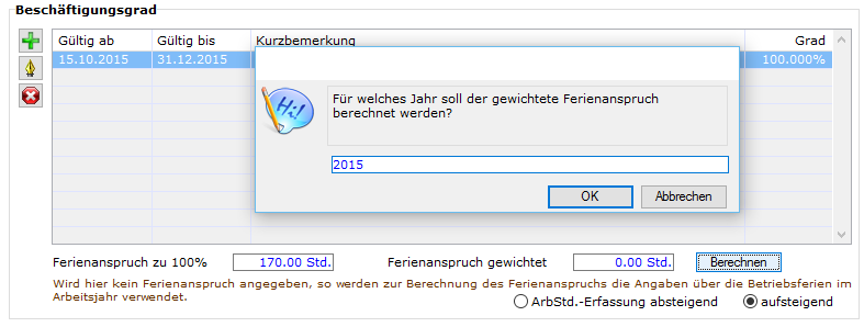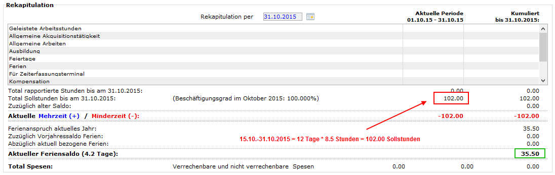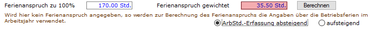 Da in diesem Fall die Stunden für den Ferienanspruch nicht berechnet werden, muss ins Feld "Ferienanspruch" der Wert manuell eingetragen werden. Hier in diesem Beispiel sind es 170 Stunden geteilt durch 12 Monate mal 2.5 Monate = 35.5 Stunden aufgerundet:
