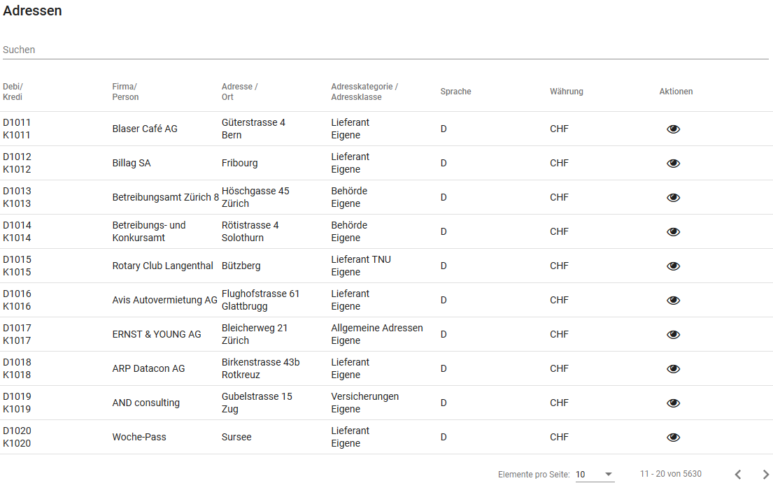 In der Adressliste werden alle nicht ausgeblendeten Adressen gezeigt. Im Suchfeld "Suchen" kann nach Adressen (mit Volltext) gesucht werden. Die Suche kann auch durch weitere Parameter, die einen Abstand dazwischen aufweisen, eingeschränkt werden, indem z.B. "pro langenthal" -> bossinfo.com finden würde.