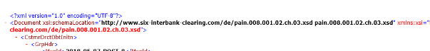 Eine pain.008-Datei ist z.B. am Dateinamen erkennbar oder im Kopf (Header) der Datei ist die Dateiversion angegeben. Hier im Beispiel pain.008.001.02.ch.03.xsd