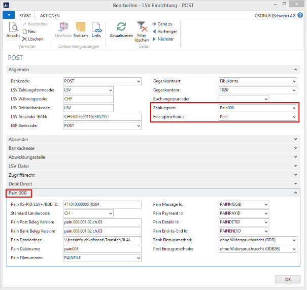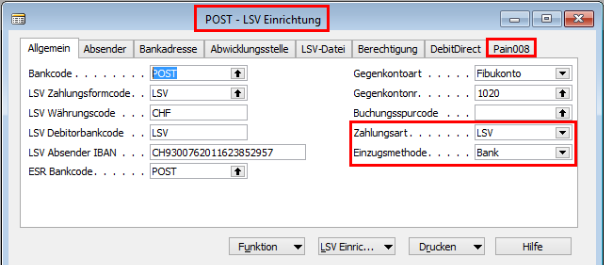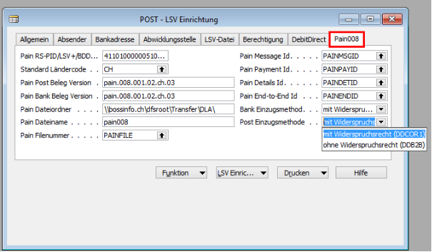 In der LSV Einrichtung wurde die Felder «Zahlungsart» und «Einzugsmethode sowie das Register «Pain.008» hinzugefügt.