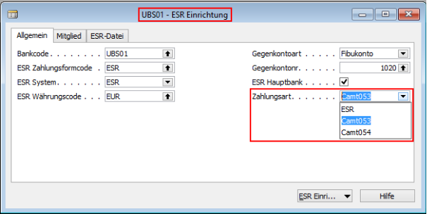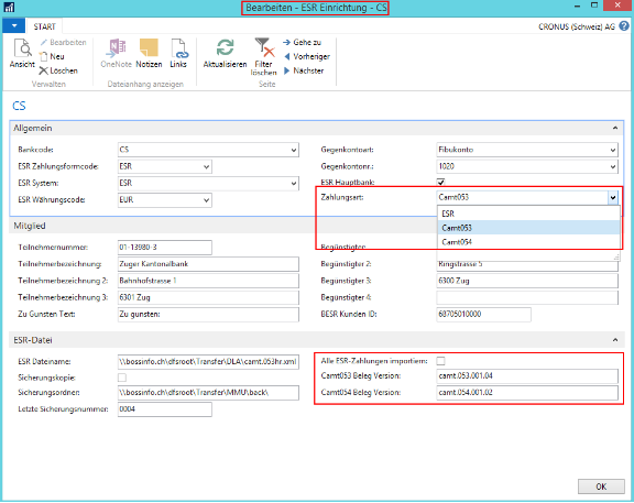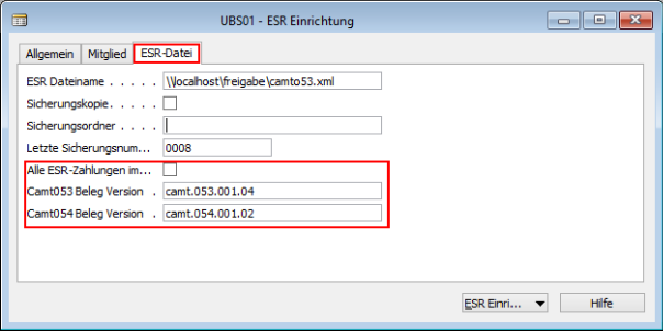 In der ESR Einrichtung wurde das Feld «Zahlungsart» und im Tab ESR Datei zwei Felder Camt053/54 Beleg Version hinzugefügt.